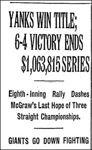 “Yanks Win Title; 6-4 Victory Ends $1,063,815 Series.” New York Times (1923-), Oct 16, 1923:  Page 1.